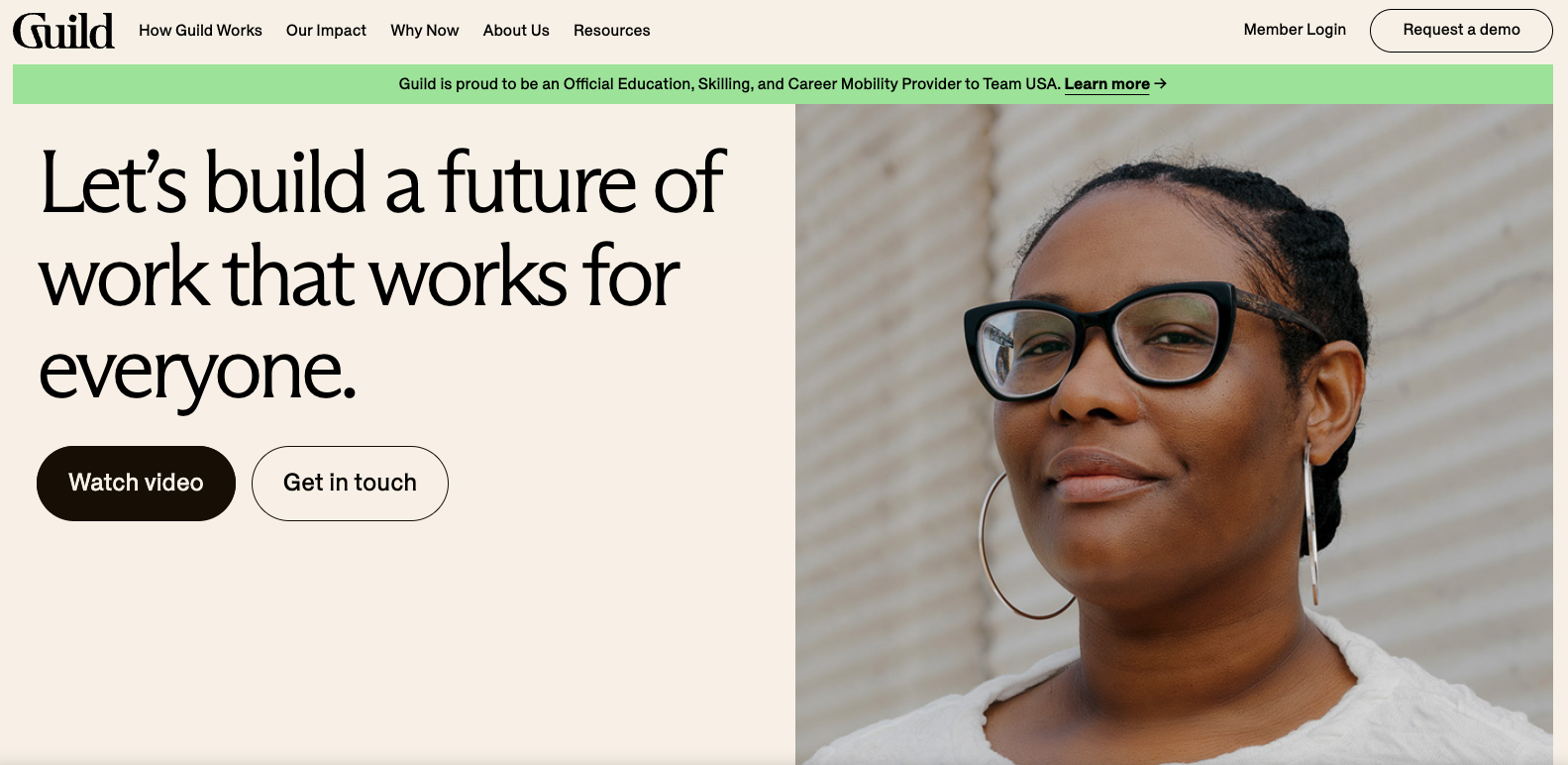 Offering a curated marketplace of learning programs, dedicated career coaches, and tools to help employees explore and grow within their careers, Guild is an educational platform that helps employers provide tuition-free education, skilling, and career mobility to their workforce.