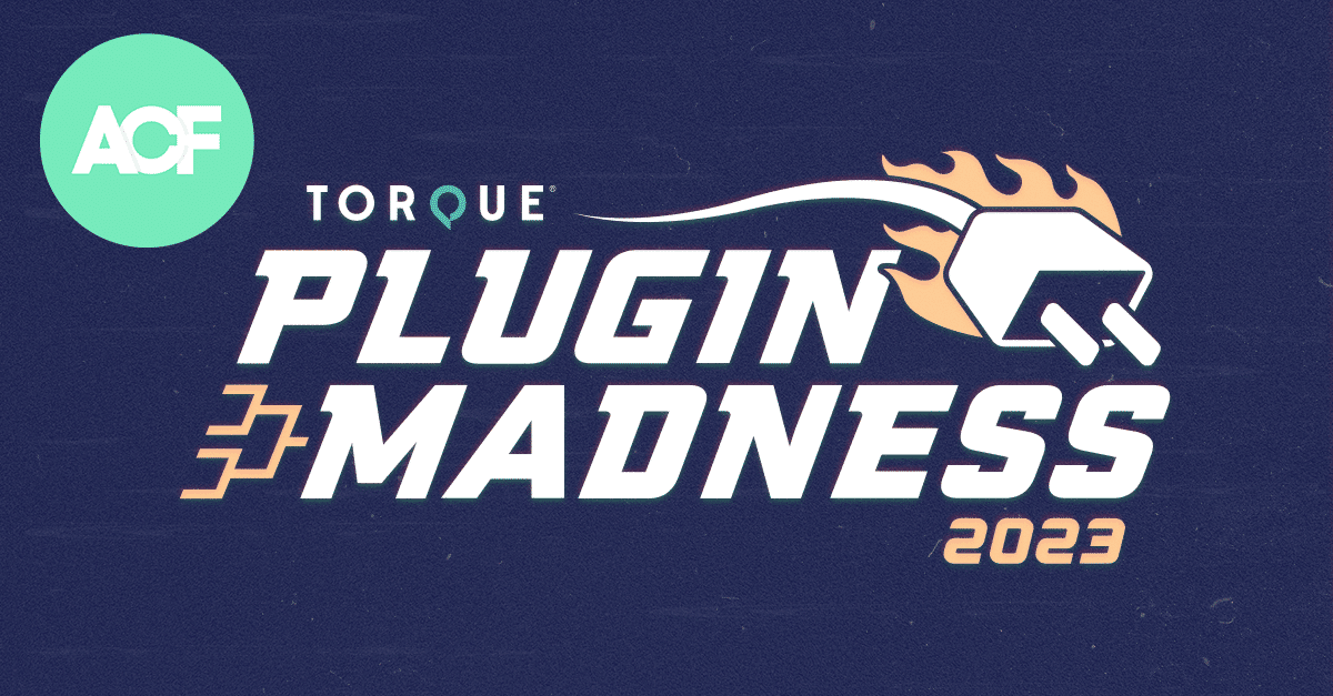 Plugin Madness promotional image for 2023 with ACF logo in the top lefthand corner