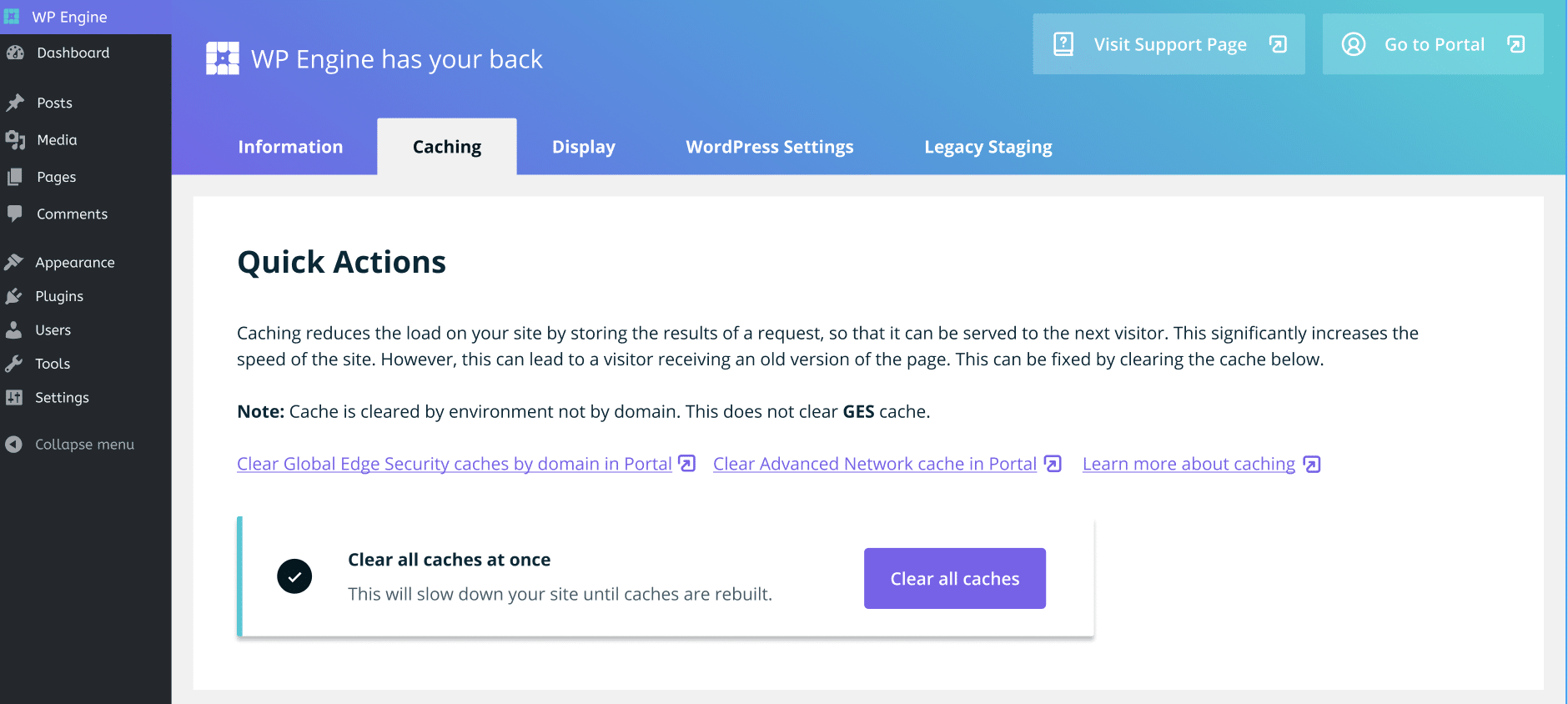 Once enabled, you’ll gain easy access to your cache settings at any time, with the ability to clear all caches at once, and confidence that what your sites are showing is true.