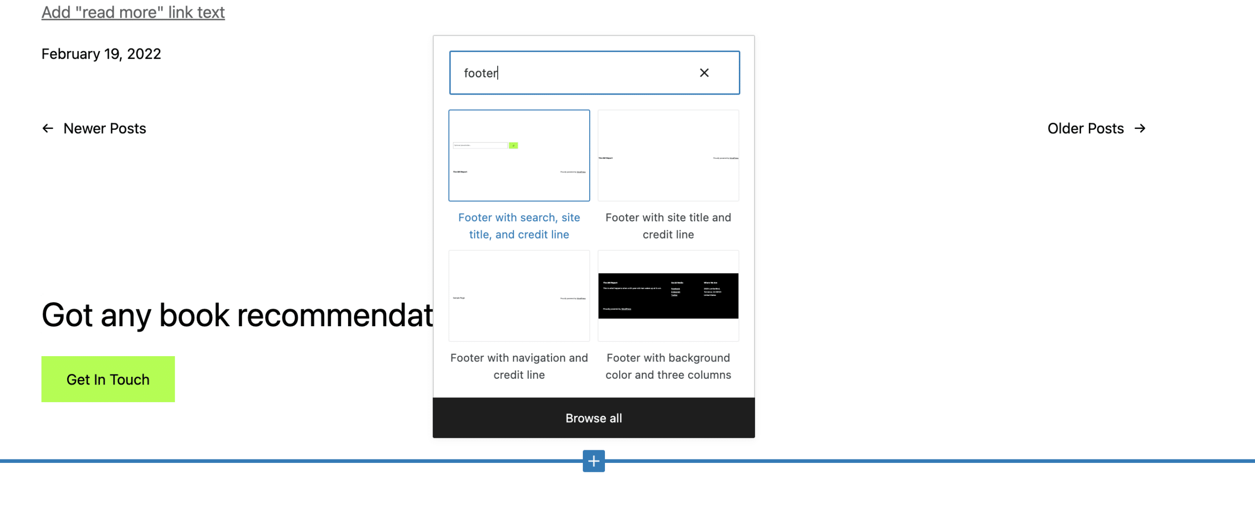 As noted above, other themes will provide different ways to use Widgets for editing the site footer. Using the Twenty Twenty-Two theme, for example, you can add widgets to the footer area the same way you would add blocks to a page.