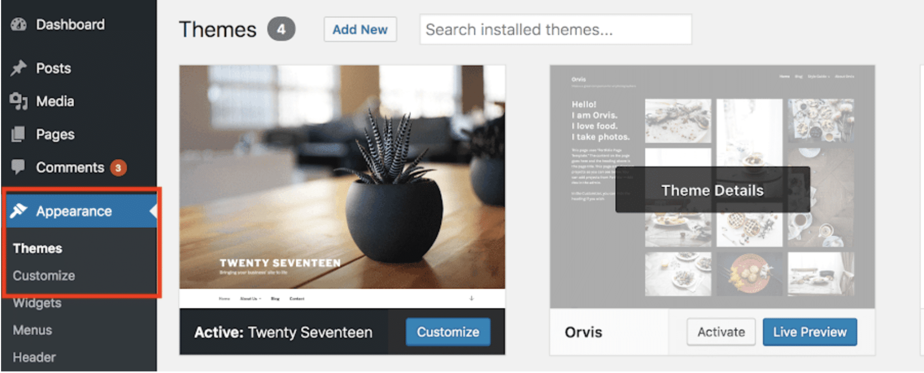 Each theme is unique, but generally, to begin editing your website footer, you’ll open the WordPress Theme Customizer from your Admin dashboard (by selecting Appearance > Themes > Customize).