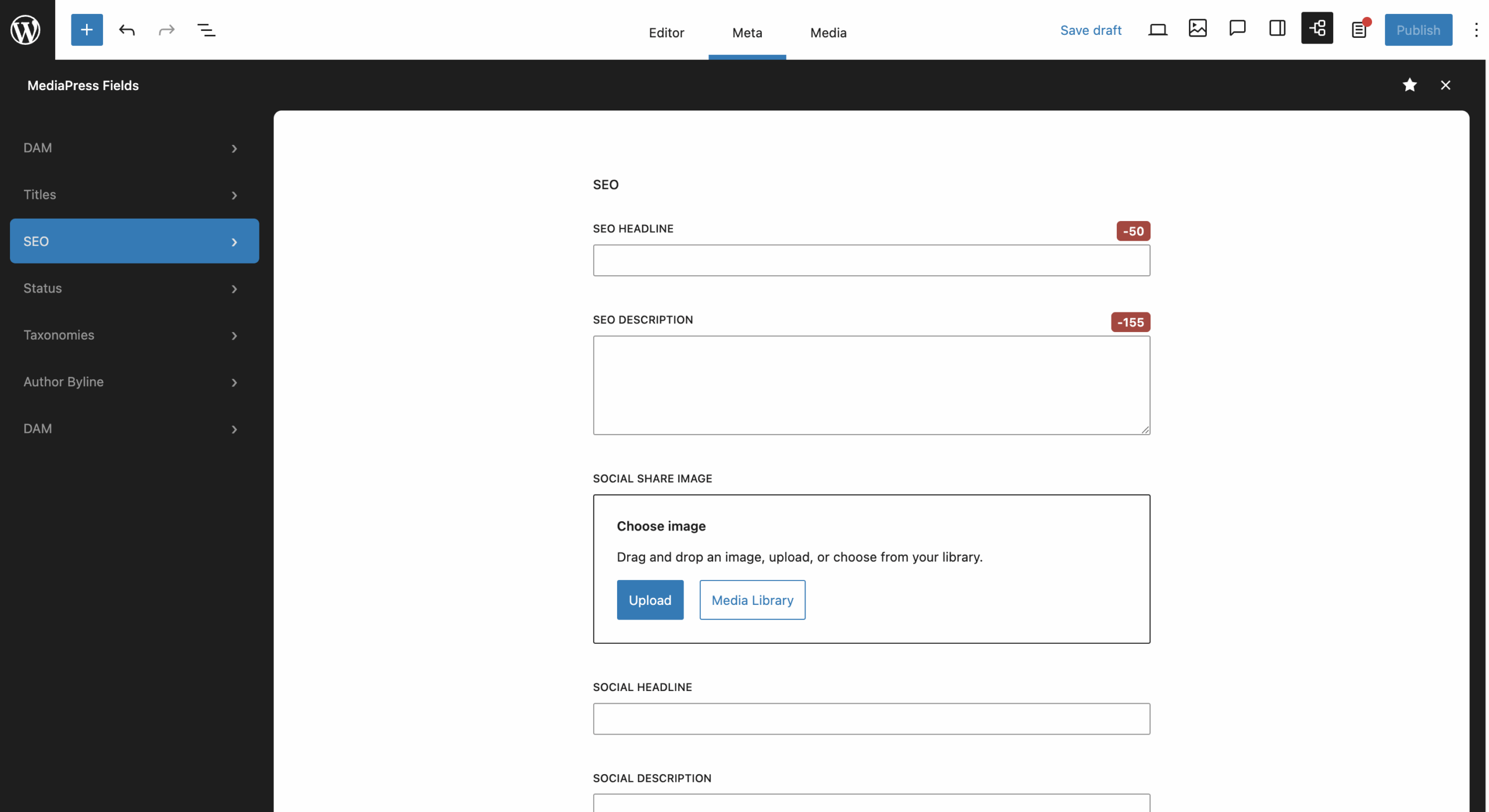 The Meta tab of the editor, with fields for SEO headline, SEO description, social images and headlines, and more. The Editor Tabs feature of Newsroom allows team members to work on different parts of a content piece at the same time.