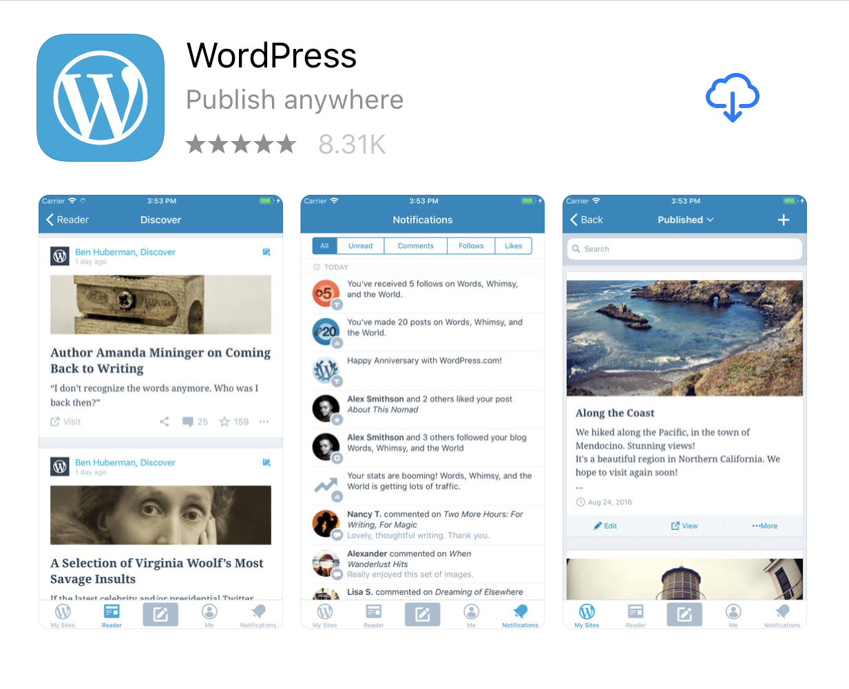 iOS download link: https://itunes.apple.com/us/app/wordpress/id335703880?mt=8