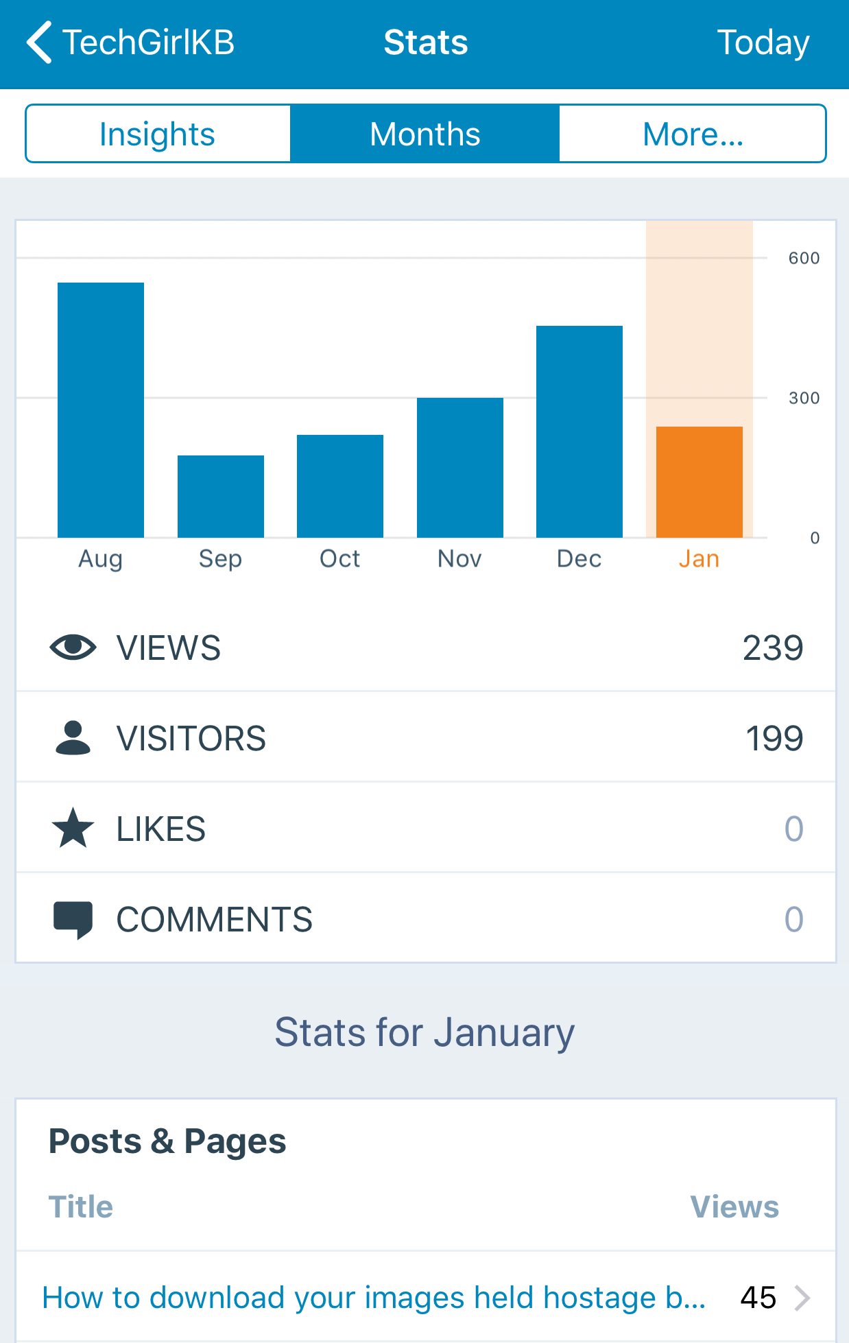 Not only does the WordPress mobile app allow you the ability to manage your posts and comments, it also provides insight into your website’s visitors. You can track these metrics from the “Stats” tab at the top of the main menu for the website. You can view data by day, week, month, and then drill down into metrics like your likes and comments, as well as the Posts and Pages driving the most views, the countries visiting your site the most, and the most popular search terms.