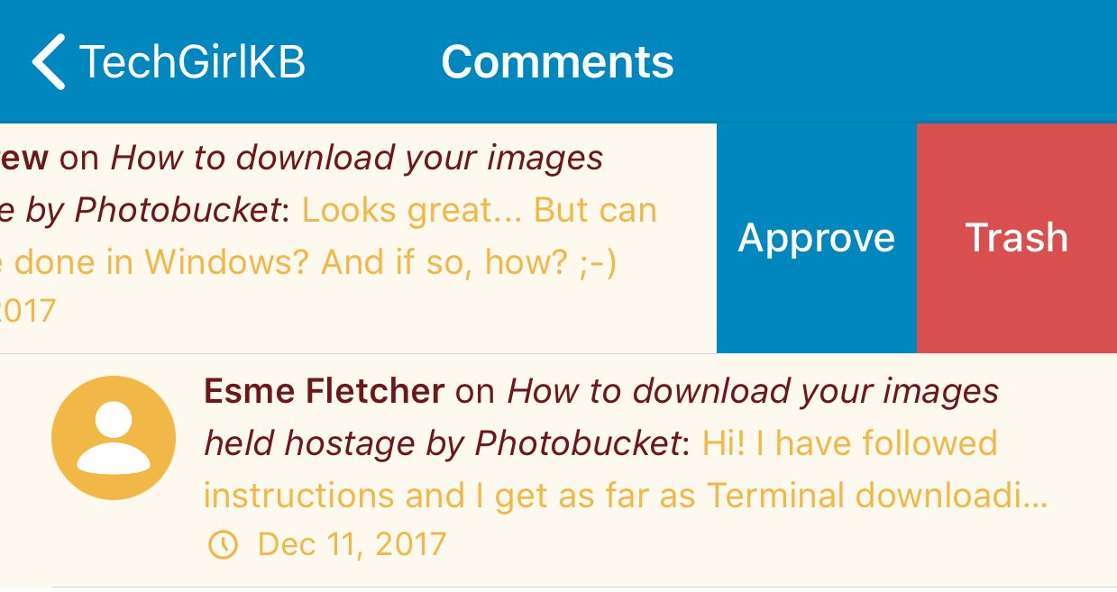Another handy feature of the WordPress mobile app is its ability to manage comments on the go. I logged into one of my sites and saw a large influx of spam comments. I can easily delete or approve them using the app. Just select “Comments” from the main menu, then select the comment to approve or deny it. Or, like many of your mobile apps, you can simply swipe left to Approve or Trash the comment in a single motion.