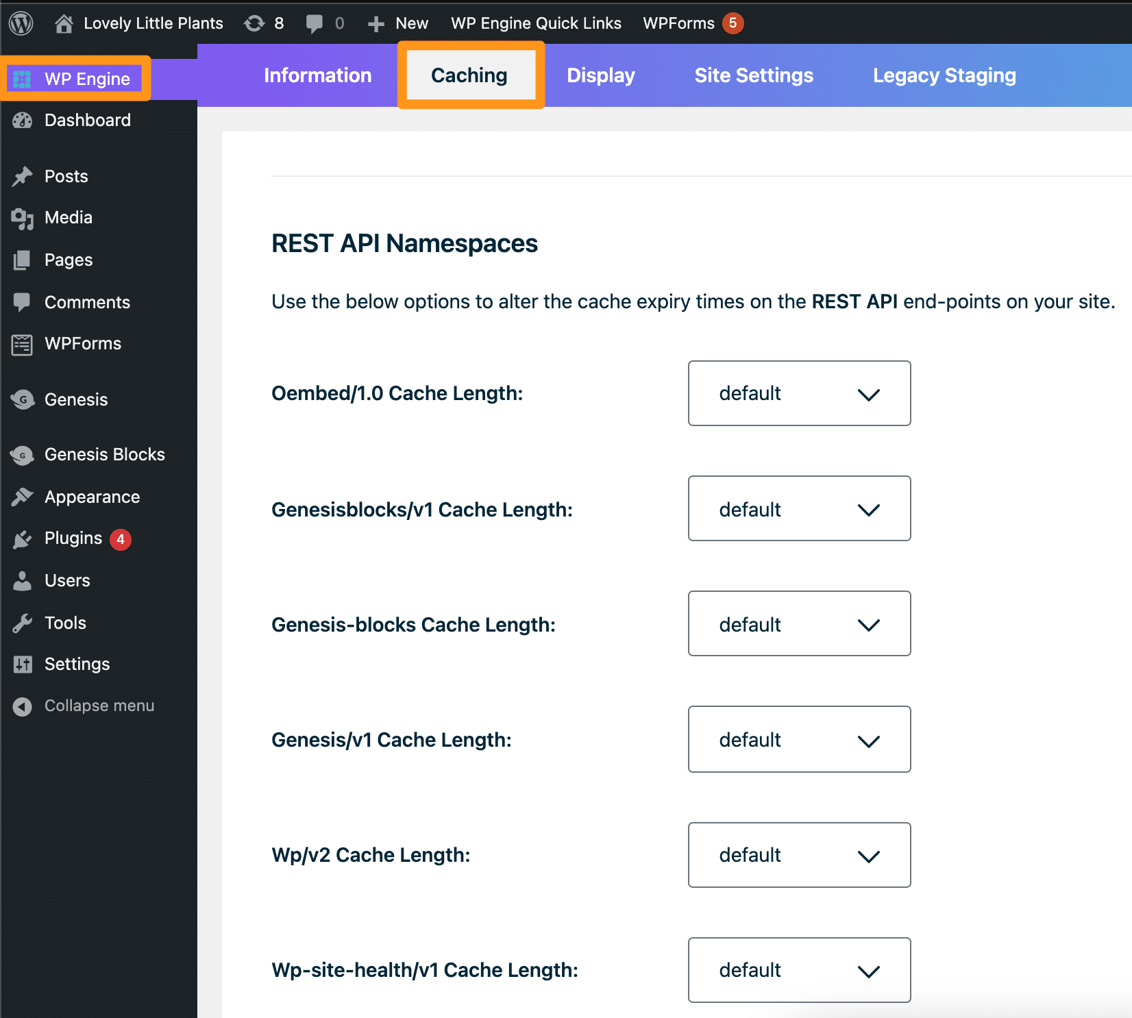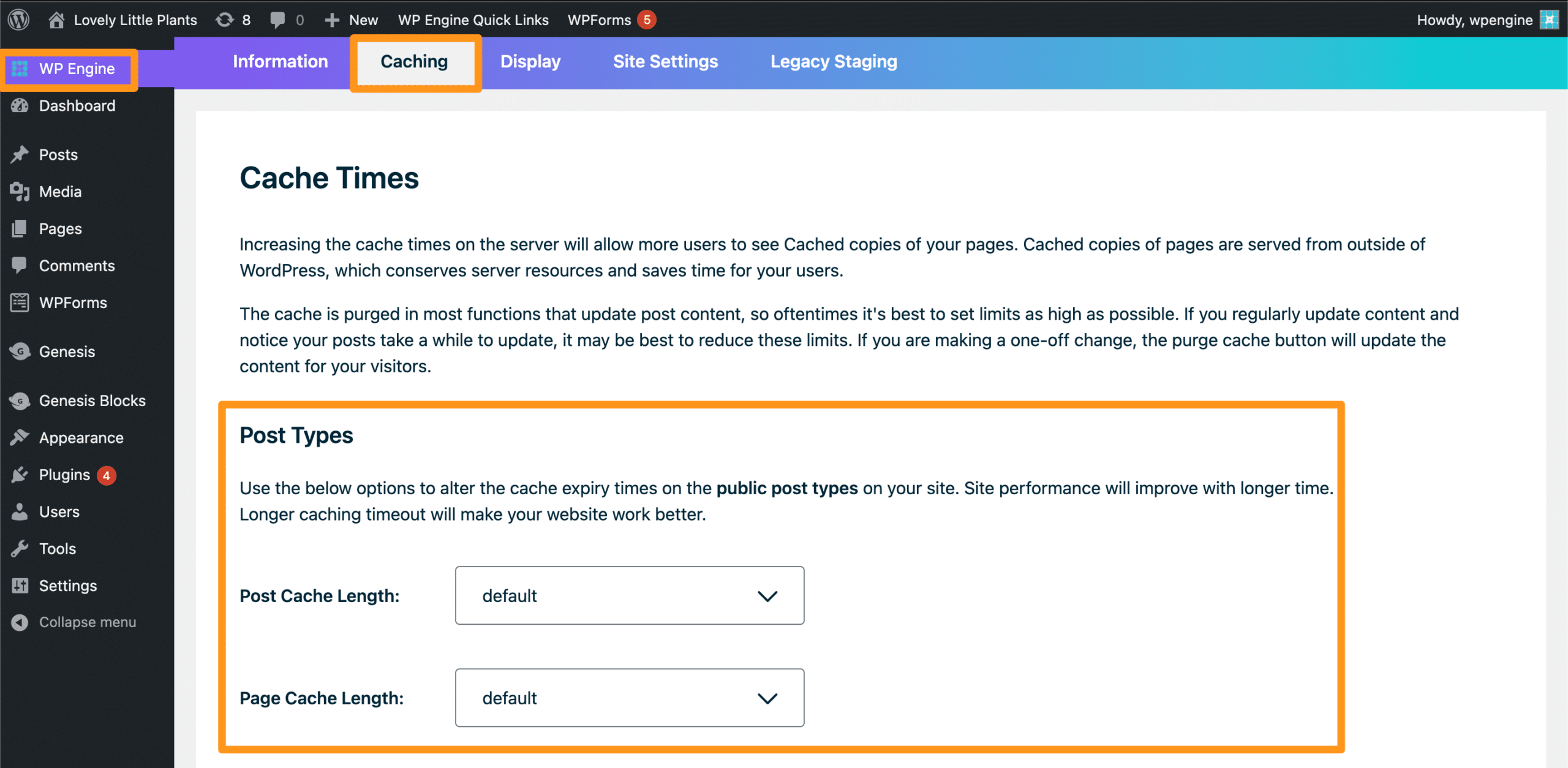 Cache expiry for WordPress post and pages can be increased by way of the WP Engine mu-plugin available in the WordPress admin dashboard of the website. To take effect, a change must be made from the default setting and then saved.