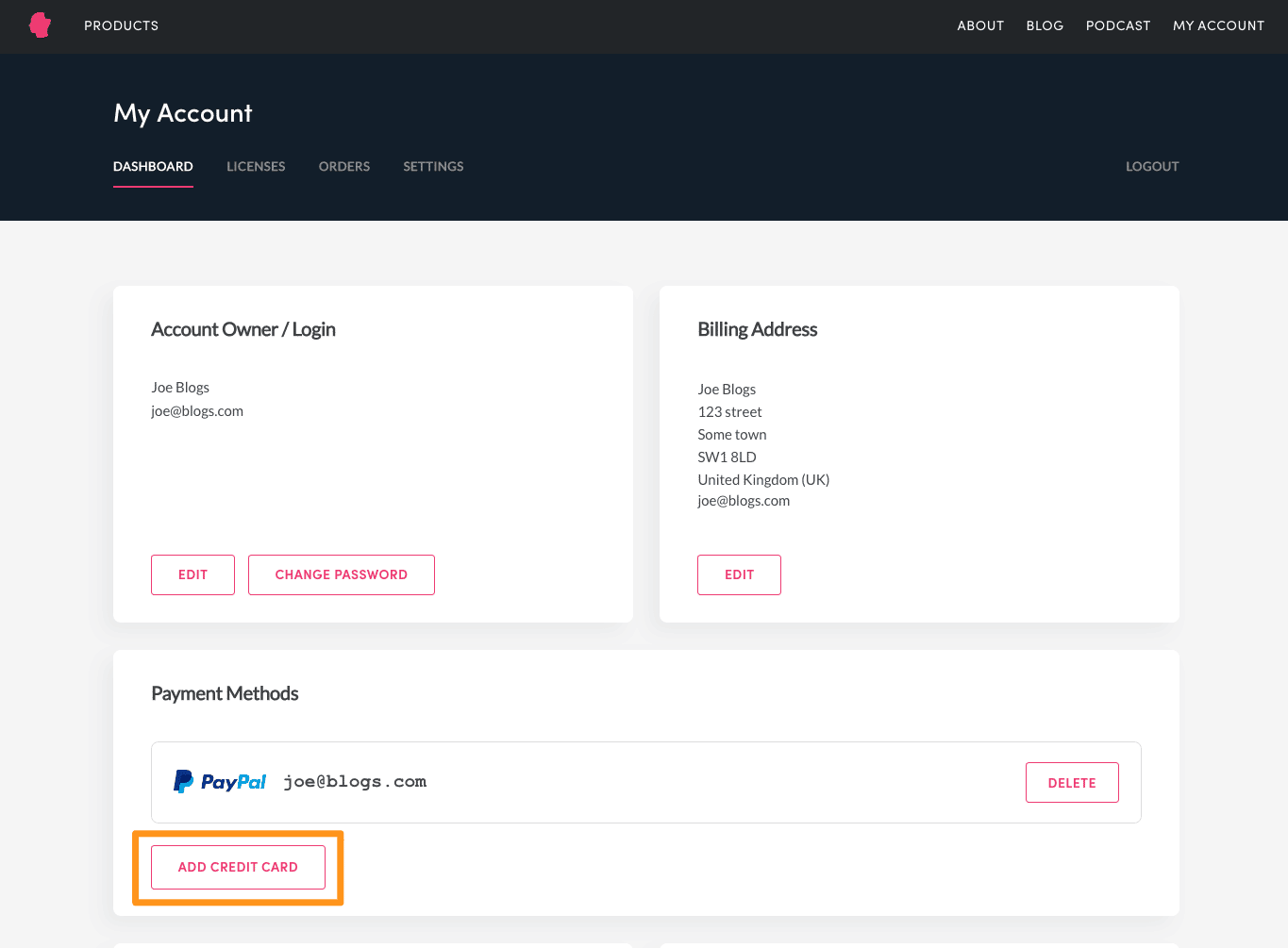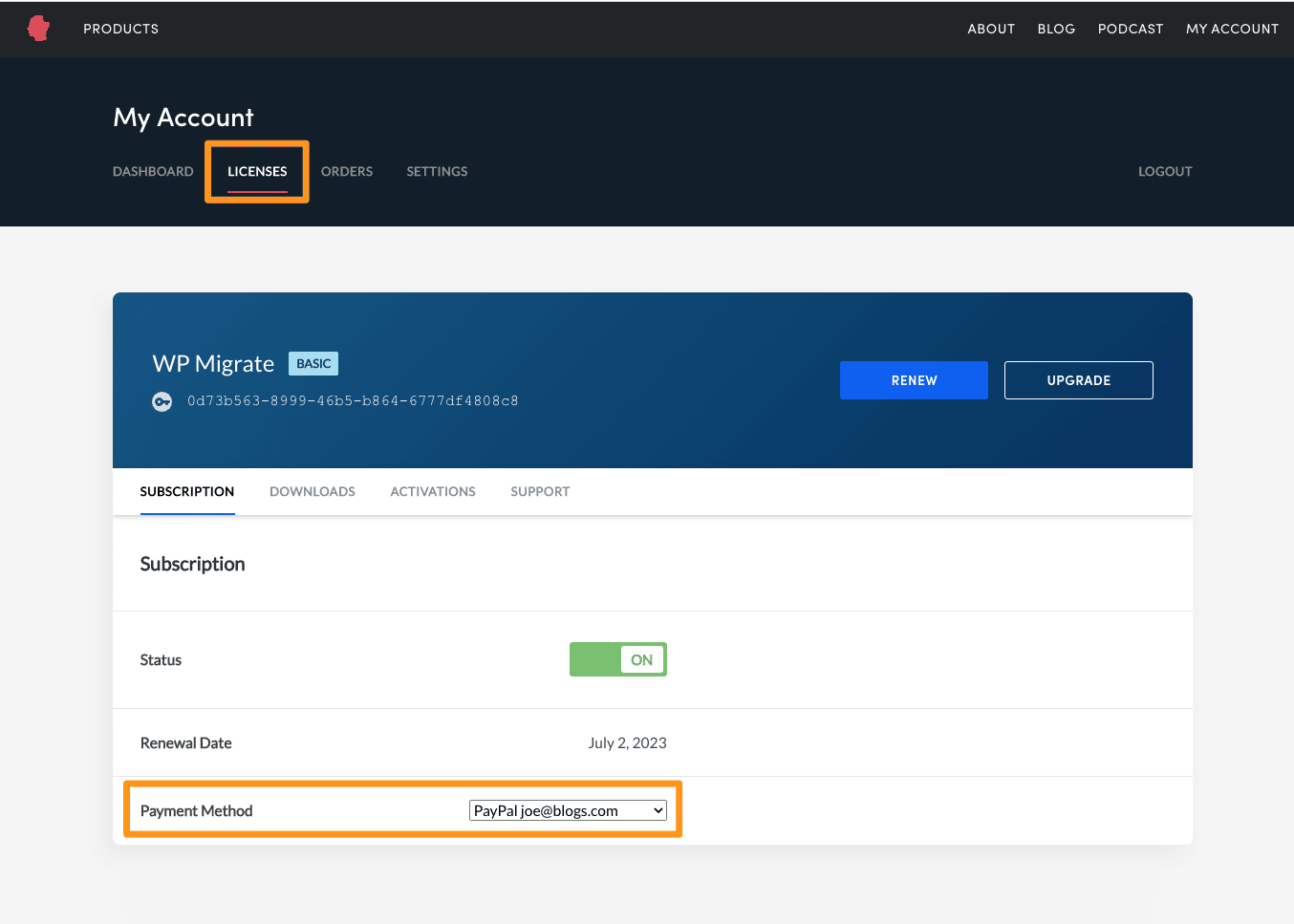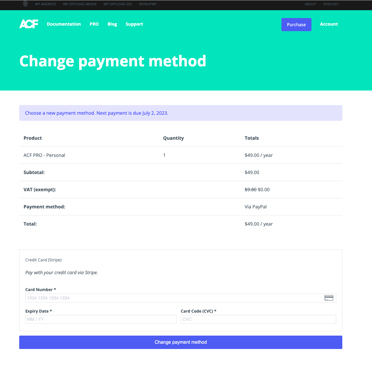 If you need to update your payment method for a WP MigrateWP Offload MediaWP Offload SES, and Better Search Replace, for example if the payment method is expired or declines, this can be done in the My Account page of the Delicious Brains dashboard.