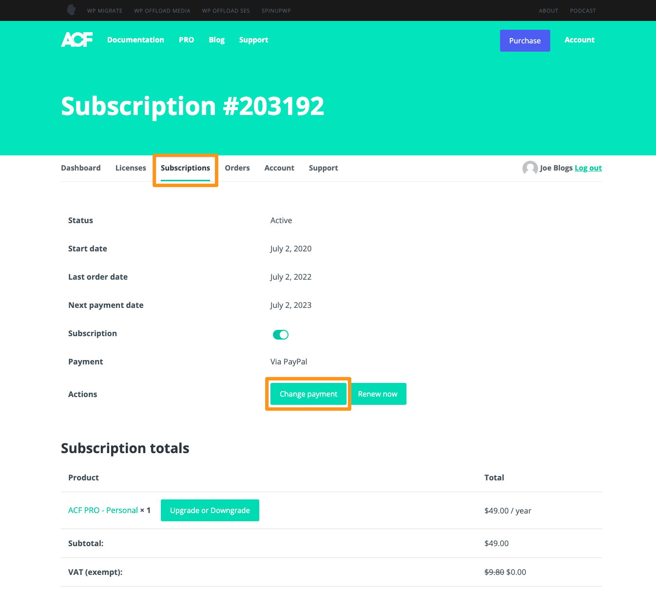 To unsubscribe from the automatic renewal for ACF Pro, log into your account area and navigate to the Subscriptions page. Once there, view your subscription and toggle the Auto renew switch to the off position. For WP Migrate, if your auto-renewal is confirmed to be ‘OFF’, your subscription will automatically expire and cancel on its expiration date. Ensure these steps are completed prior to your renewal date to avoid unwanted charges.