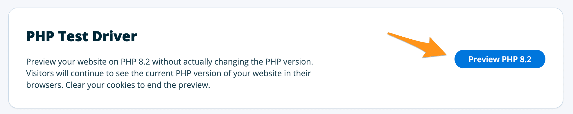 The PHP Test Driver can be used to view the website on a different version of PHP. After logging in to the website, a special cookie is applied to the session which allows only your browser to see the site on that PHP version. Other visitors continue to see the site as normal without disruption. If the Test Driver is working, there will be a “Test Drive” banner in the WP Admin. The Test Driver functionality will work for wp-admin users at the Editor role or above, and will be cleared when the session ends or cache is cleared.