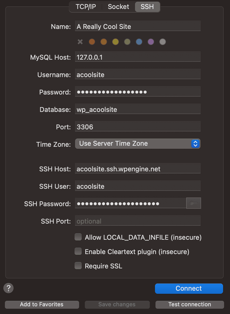 Click Test Connection to be prompted for the database password retrieved above. This can also be found in ./_wpeprivate/config.json as WPENGINE_SESSION_DB_PASSWORD.