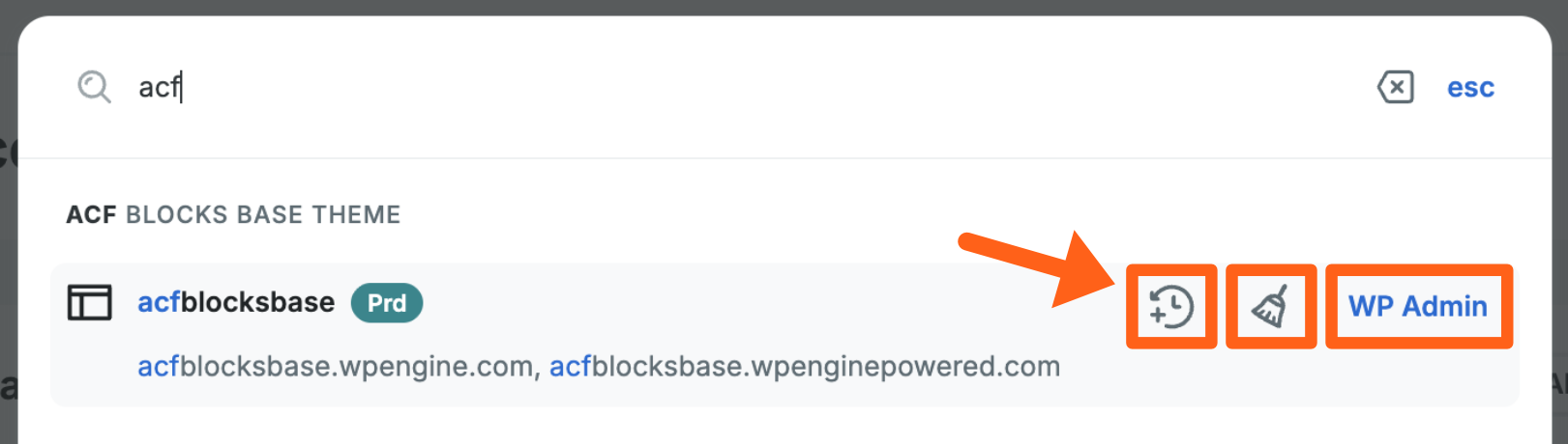 - Sites: A site can show in the results if the site name, or any of its environment names or domain names match the search phrase. Within each site returned you will see the site name and the site’s matching environments grouped below it. If the site name itself matches then all of the site’s environments will show. Any domain names that match the search phrase will also be shown below each environment.