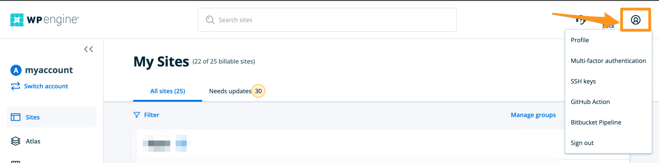 The Sites page can be accessed by clicking Sites in the main menu of the User Portal, or at the following link: https://my.wpengine.com/sites