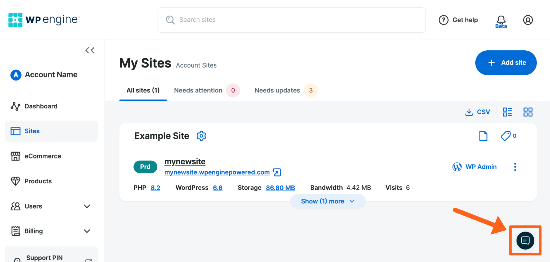 The Sites page is the central hub for managing your sites on WP Engine. This page offers site and environment management tools, such as details about the environment’s status and the ability to make updates to certain assets, like plugins or themes. Additionally, certain accounts also have the ability to perform these actions in bulk across multiple sites at once.